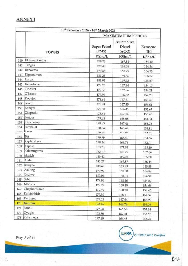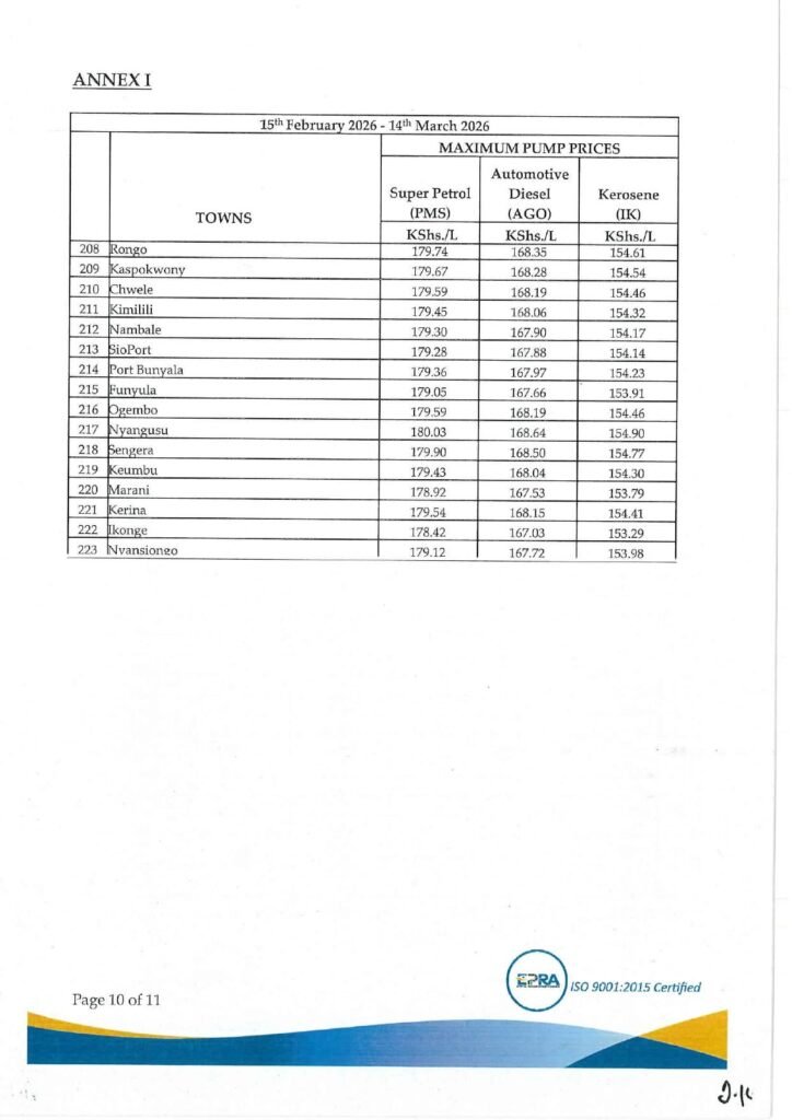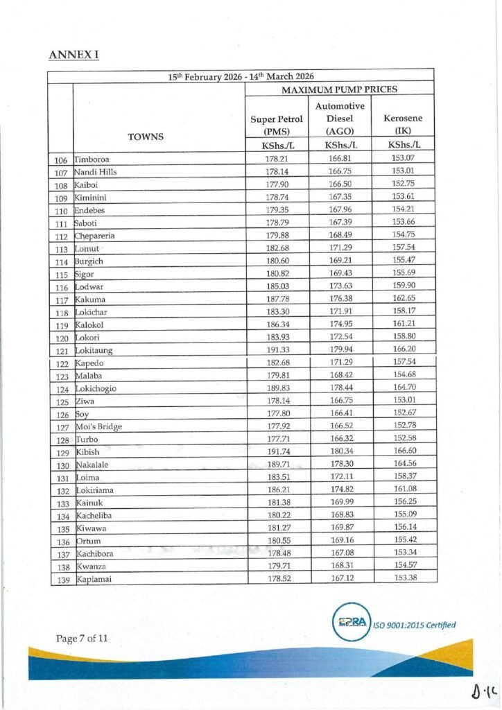 In accordance with Section 101(y) of the Petroleum Act 2019 and Legal Notice No. 192 of 2022, the Energy and Petroleum Regulatory Authority (EPRA) has announced the maximum retail prices of petroleum products that will be in force from 15th February 2026 to 14th March 2026.